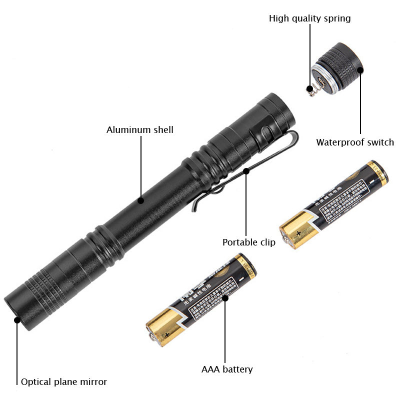 Product Description: Mini High-Power Flashlight Product Overview Explore the unknown, start with this mini high-power flashlight. Its compact size (132mm x 15mm) makes it an ideal choice for your daily carry, lightweight and portable, suitable for any occasion. Whether it is outdoor adventures, night hiking, or emergency backup at home, this flashlight can provide you with a reliable light source. Superior Performance The flashlight uses an efficient CREE XPE-R3 wick to provide powerful light brightness. Despite its compact size, you can still enjoy a range of up to 100 meters, ensuring that you can always see your surroundings clearly in the dark. The flashlight has 1 level of brightness, which is enough to meet daily lighting needs, allowing you to walk confidently in any situation. Design and Material The barrel of this flashlight is made of high-strength aluminum alloy, which has excellent durability and impact resistance. Its anodized treatment makes the flashlight not only beautiful and generous, but also effectively prevents scratches and corrosion. Whether it is a wet rainy day or a dusty environment, you can use it with confidence. Convenient use experience The flashlight is equipped with a push-button switch located at the tail design, which is convenient for users to operate with one hand. Whether it is to quickly light up or turn off the flashlight, you can easily deal with it. In addition, the flashlight is powered by two AA batteries, and the batteries are easy to replace, ensuring that you will not be disappointed in an emergency. Multiple application scenarios This mini high-power flashlight is suitable for a variety of scenarios. Whether it is outdoor camping, night fishing, home repairs or self-driving tours, it is your indispensable companion. Its fixed-focus design makes the beam concentrated, which can effectively illuminate distant targets, allowing you to move forward fearlessly in the dark. Conclusion In short, this mini high-power flashlight combines excellent performance with convenient design, and is a must-have tool for every family and outdoor enthusiast. Lightweight, durable and powerful, it will become a trustworthy partner in your daily life. Choose this flashlight to make every adventure full of light and safety!