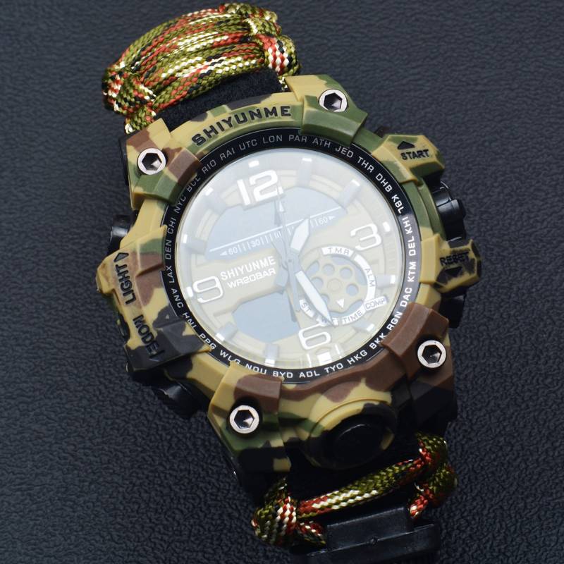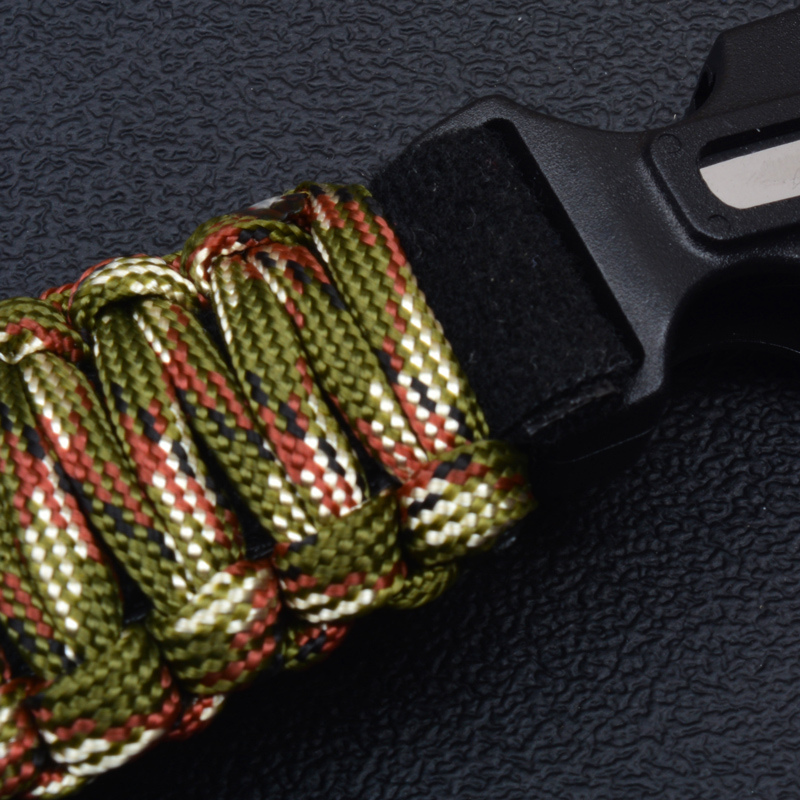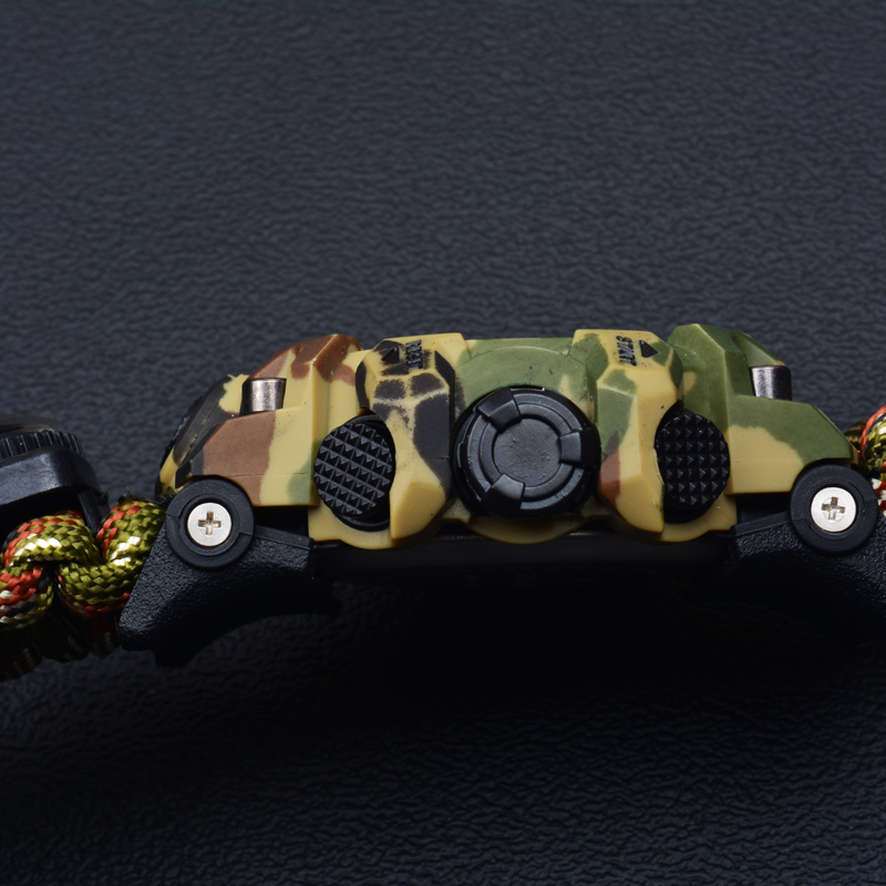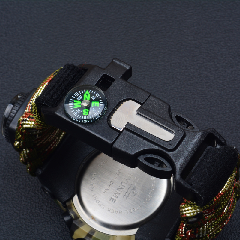 Multifunctional outdoor equipment emergency survival bracelet watch – an all-round assistant for adventure Product highlights 1. Bracelet and watch two-in-one design The innovative two-in-one design perfectly integrates the functions of the bracelet and the watch, which is convenient and practical, providing more convenience for your outdoor activities. 2. Integrated whistle The built-in high-decibel whistle is used to sound an alarm or distress signal in an emergency, ensuring that you can attract the attention of others in times of crisis. 3. Fire starter Equipped with a fire starter, it is easy to use and helps you quickly light a campfire or emergency fire source in the wild to ensure heating and cooking needs. 4. Multifunctional scraper The watch is equipped with a practical scraper, which is suitable for cutting, scraping and other purposes, increasing the choice of tools for survival and solving various small problems. 5. Accurate compass The built-in compass ensures that you can accurately navigate when exploring in the wild, avoid getting lost, and increase the safety and convenience of your trip. 6. High durability Made of high-strength materials, both the bracelet and the watch can withstand the test of harsh environments and ensure long-term reliability. 7. Waterproof function With basic waterproof capability, it can adapt to different weather conditions and humid environments, ensuring normal operation in various outdoor activities. 8. Luminous display The luminous function ensures that the time can be clearly read in dark environments, and it is very convenient to use whether it is nighttime activities or in the dark. Applicable scenarios 1. Field exploration: All-round functional design to meet various needs of field exploration and improve safety and convenience. 2. Camping and hiking: Practical tools such as whistle, fire starter and scraper increase the survival ability in camping and hiking activities. 3. Emergency: With emergency functions such as whistle and fire starter, it ensures rapid response in times of crisis. 4. Tactical training: Suitable for tactical training and survival skills training, adding practical tools and improving training effects.