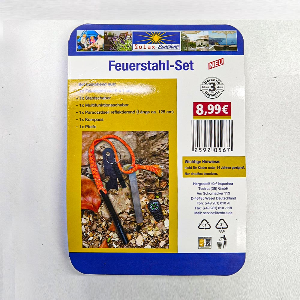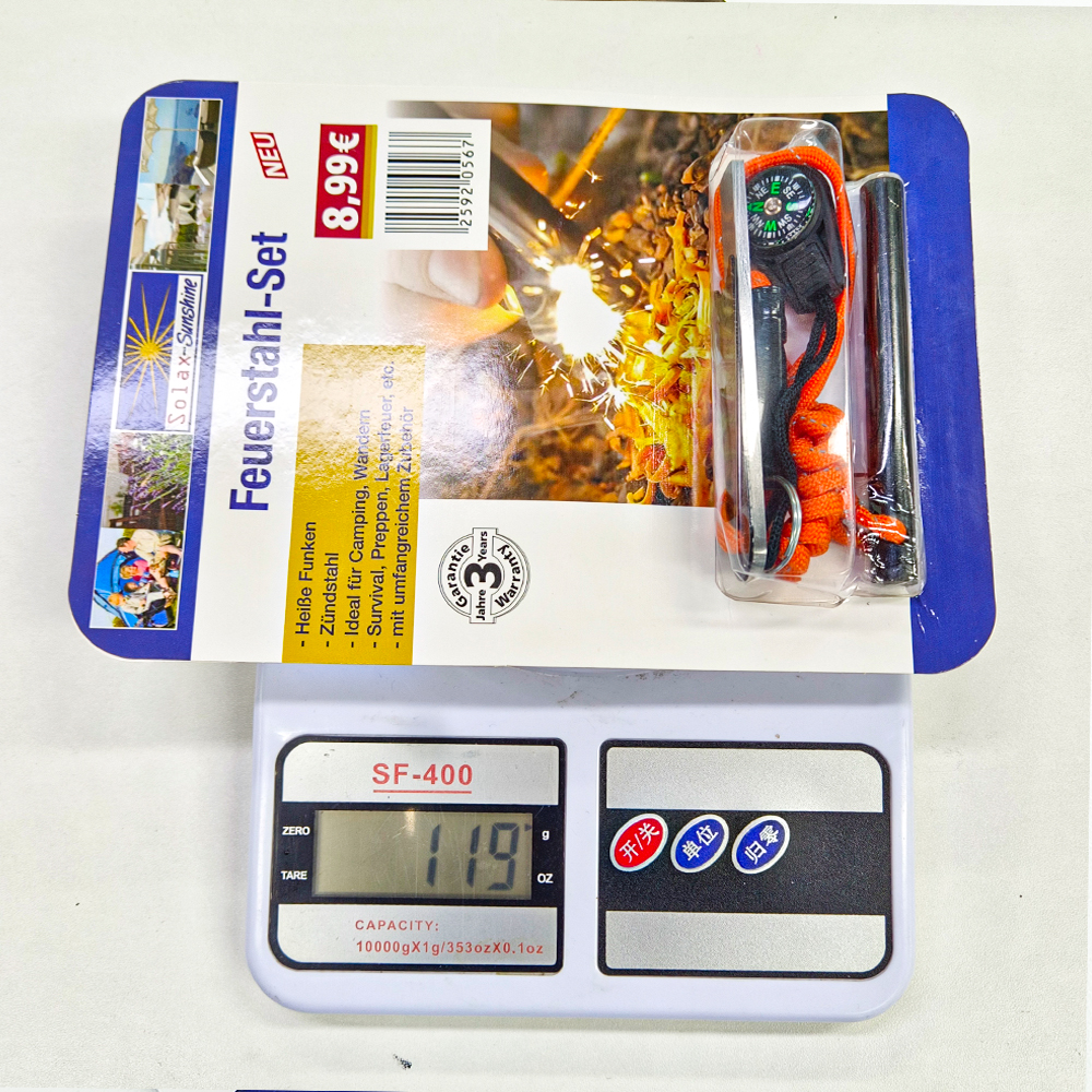 Function: fire stick, compass, whistle, parachute rope, scraper, ruler